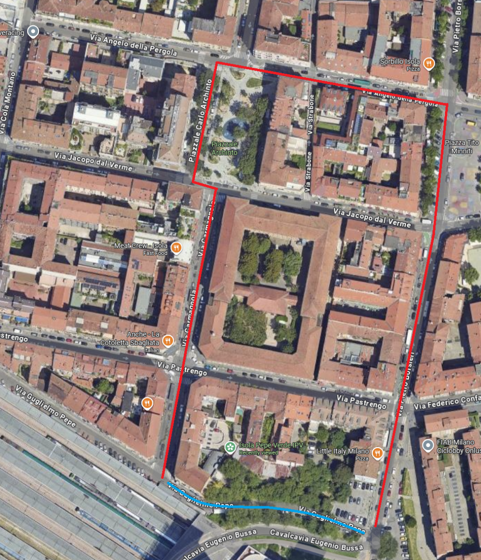 L’area, precedentemente adibita a parcheggio auto, è stata “riqualificata” inserendovi un mezzo campo da basket sghembo e una striscia di terra adibita a giardinetto. Conclude l’opera la pedonalizzazione del primo tratto di via Pepe, quello compreso fra via Borsieri e via Carmagnola, costringendo gli automobilisti a percorrere un tratto circa 5,5 volte più lungo per raggiungere lo stesso punto.